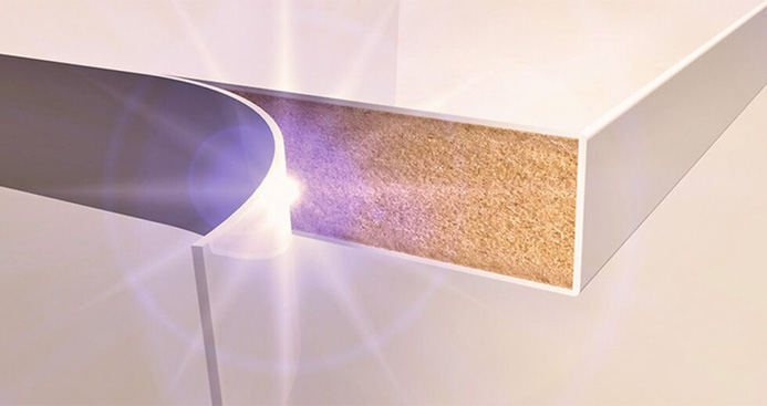 Laserowe łączenie obrzeży - niemieckiej firmy REHAU (ABS o grubości od 1 do 3 mm). Jako efekt otrzymujemy bezspoinowe połączenie materiałów na krawędzi skrzydła drzwiowego, wyższą jakość produktu oraz podwyższone walory estetyczne.